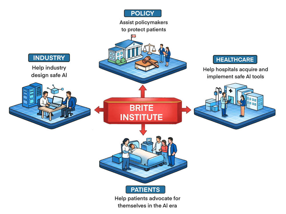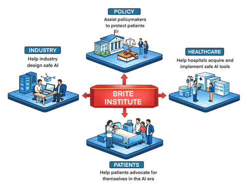 BRITE Institute is a research and development nonprofit organization dedicated to ensuring AI improves patient care and safety - and that AI does not endanger patient safety. We conduct both basic and applied research, work with industry, and develop tools to improve the design and implimentation of AI in heatlhcare.